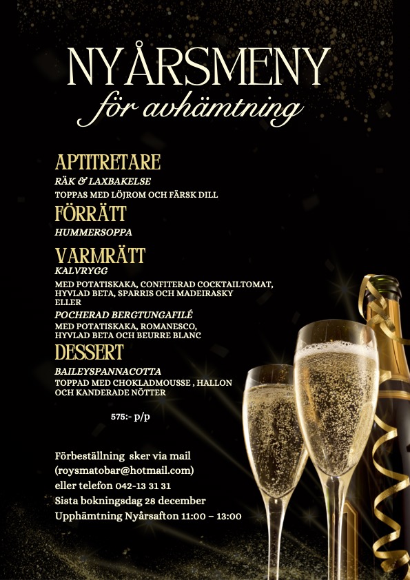 Sista bokningsdag 28/12. Avhämtning och betalning sker på Roy's, Kajpromenaden 21,